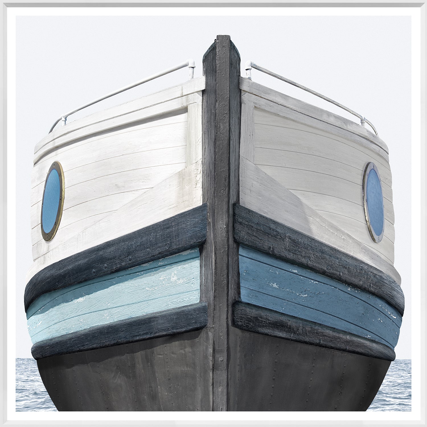 Seaworn Bows IV by Celadon Studio captures the quiet strength and timeless character of the sea. This striking square photograph highlights the bow of a ship, where soft tones of white and blue meet the contrasting depth of slate grey. Subtle details—a deck railing and portholes—add authenticity and dimension, inviting the viewer to appreciate the craftsmanship of maritime design.