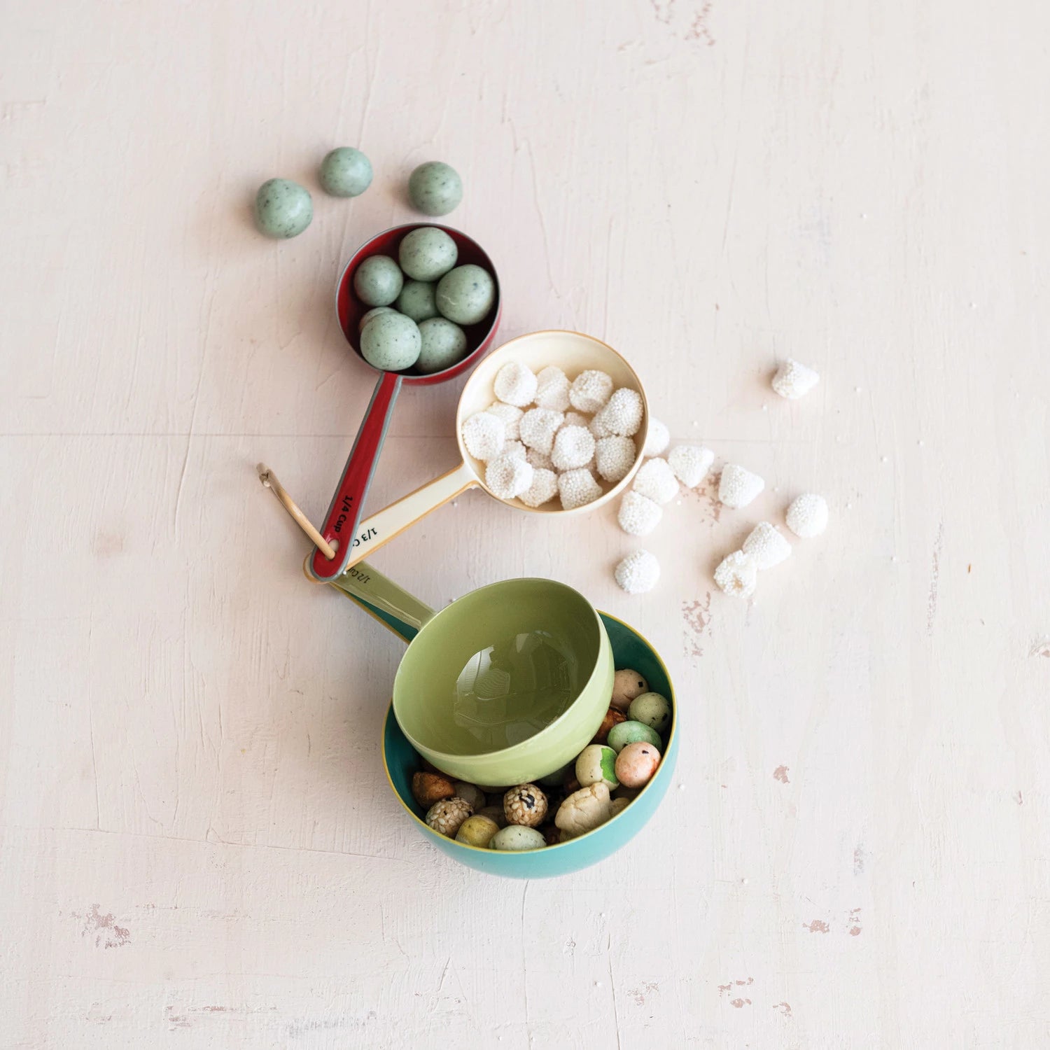 1, 1/2, 1/3, 1/4 Cup Enameled Stainless Steel Measuring Cups, 4 Colors, Set of 4