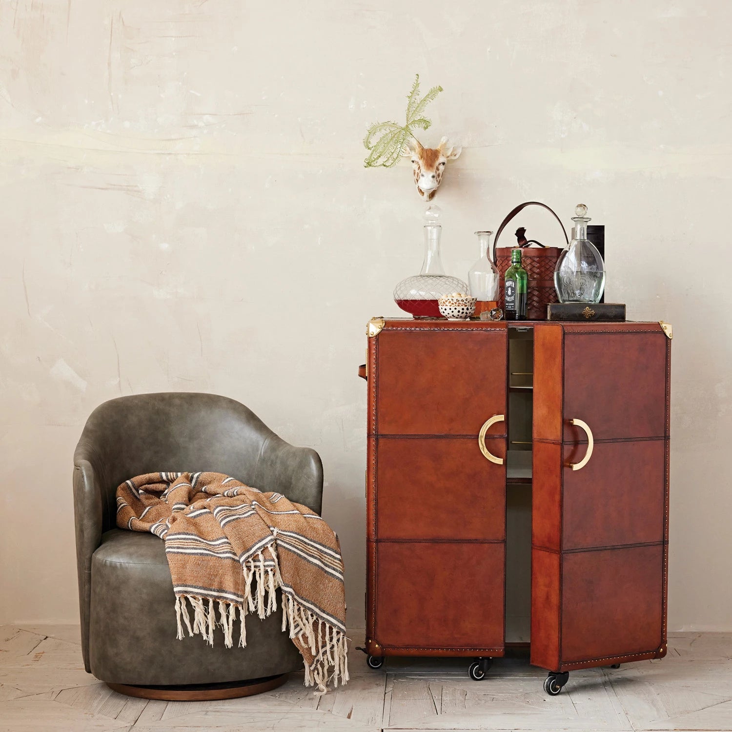 Crafted from MDF and leather in a warm cognac finish, the cabinet showcases brass hardware, a mirrored back, and a plush flocked interior that exudes refinement. Inside, you’ll find eight shelves and eight bottle cubbies, providing generous storage for glassware, spirits, and bar accessories.