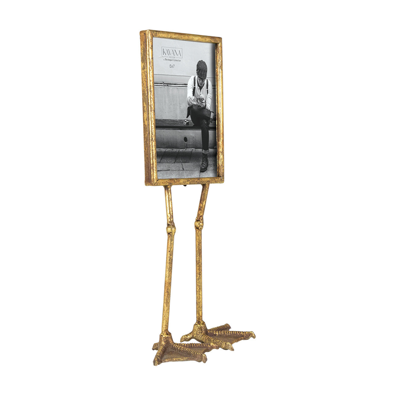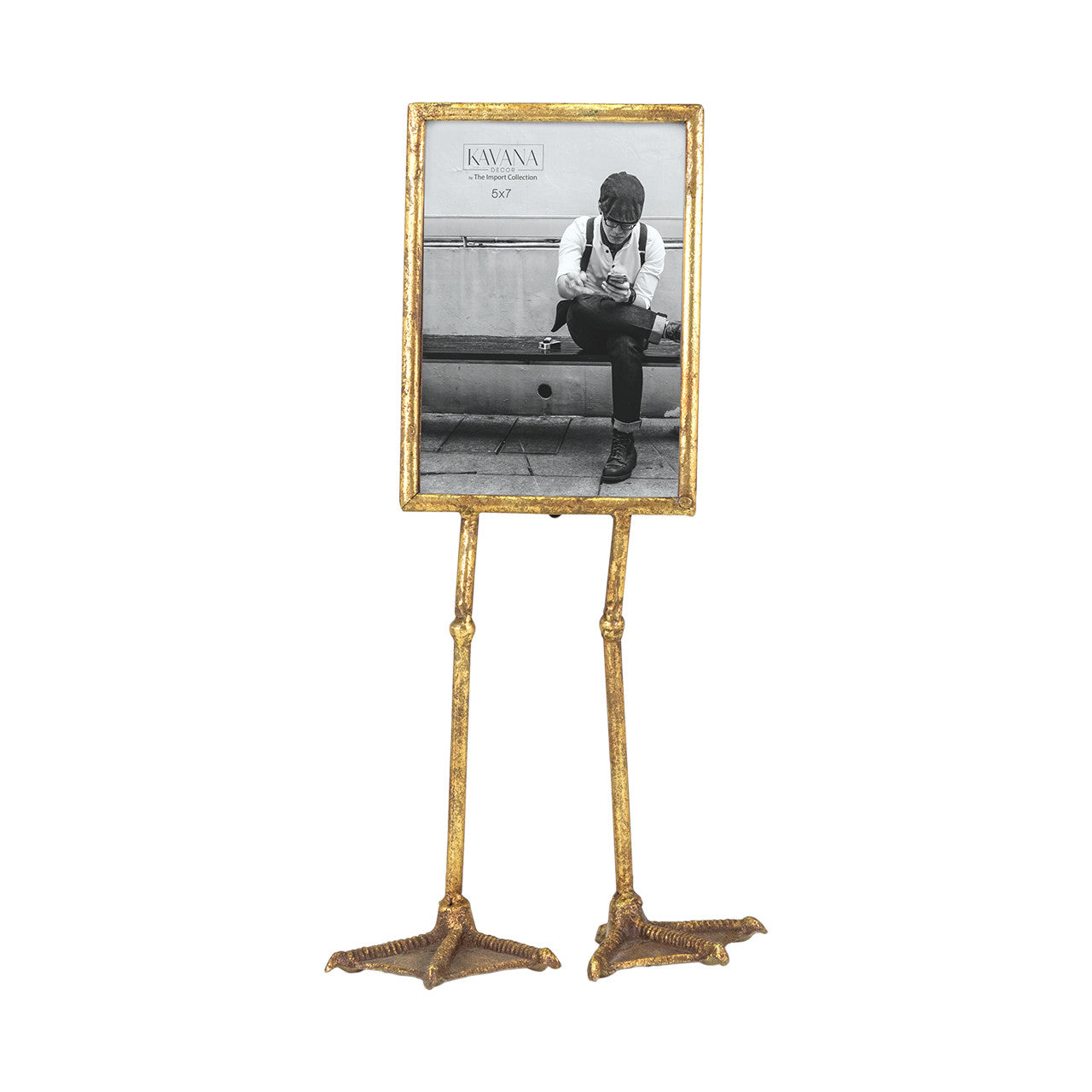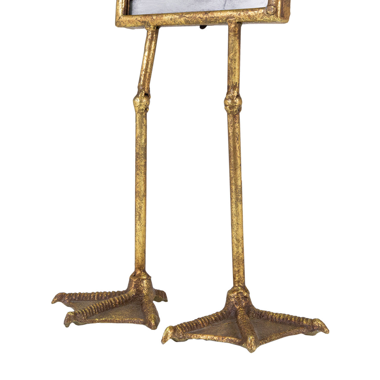 Bring character and charm to your decor with the Donald Vertical Frame, a whimsical photo display that features a distressed gold finish and playfully sculpted duck legs. Standing 15 inches tall and 7.5 inches wide, this distinctive frame is designed to hold a 5x7 photo, making it an ideal accent for desktops, consoles, or shelf vignettes. The handcrafted iron construction and rich antique gold tones lend a vintage allure, while the quirky legged base ensures it stands out in any setting. Whether styled solo or as part of a curated frame collection, this decorative piece blends humor with elegance, adding a conversation-worthy element to modern, eclectic, or transitional interiors. Make your photo displays stand tall and unforgettable with this eye-catching frame from Kavana Decor.