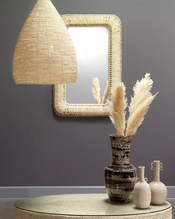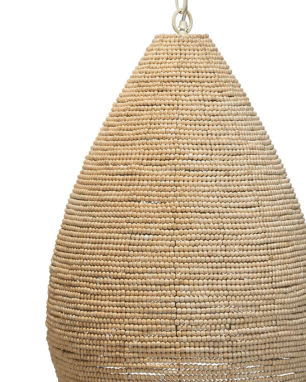 Strings of beads made with mango wood line the body of the oversized Gulf Stream Pendant. A white iron chain compliments the natural tone and texture of this piece. A statement piece with repeating patterns and textures like this can help add interest to any coastal palette.
