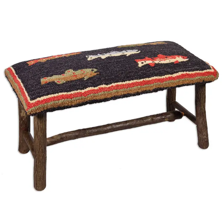 Bring a touch of nature-inspired elegance to your home with the River Fish Hickory Bench. Measuring 32" long, 17" wide, and 15" high, this handcrafted bench features a beautifully detailed hooked wool top showcasing a vibrant river fish design. The sturdy legs are made from handmade hickory, combining rustic charm with artisanal quality.