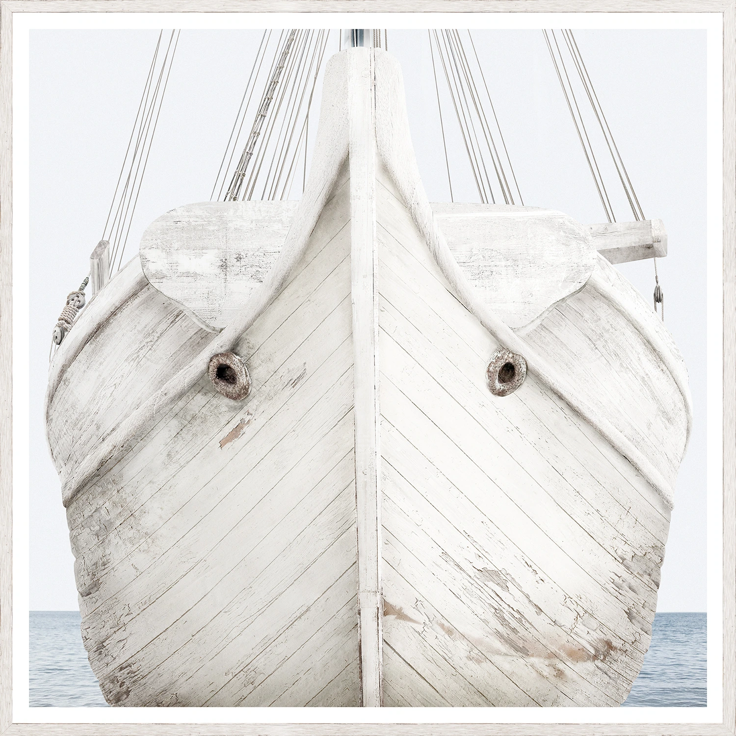 Seaworn Bows II by Celadon Studio captures the quiet strength and timeless character of the sea. This striking square photograph highlights the bow of a ship, where soft tones of white and blue meet the contrasting depth of slate grey. Subtle details—a deck railing and portholes—add authenticity and dimension, inviting the viewer to appreciate the craftsmanship of maritime design.