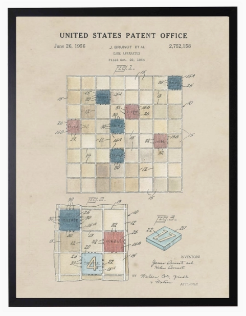 Celebrate the timeless allure of innovation and play with our Watercolor Scrabble Patent wall art. This captivating piece brings together the artistry of vintage patent designs and the charm of watercolor illustration. Each brushstroke delicately captures the essence of the original patent drawing, showcasing the ingenuity behind one of the world's most beloved board games.